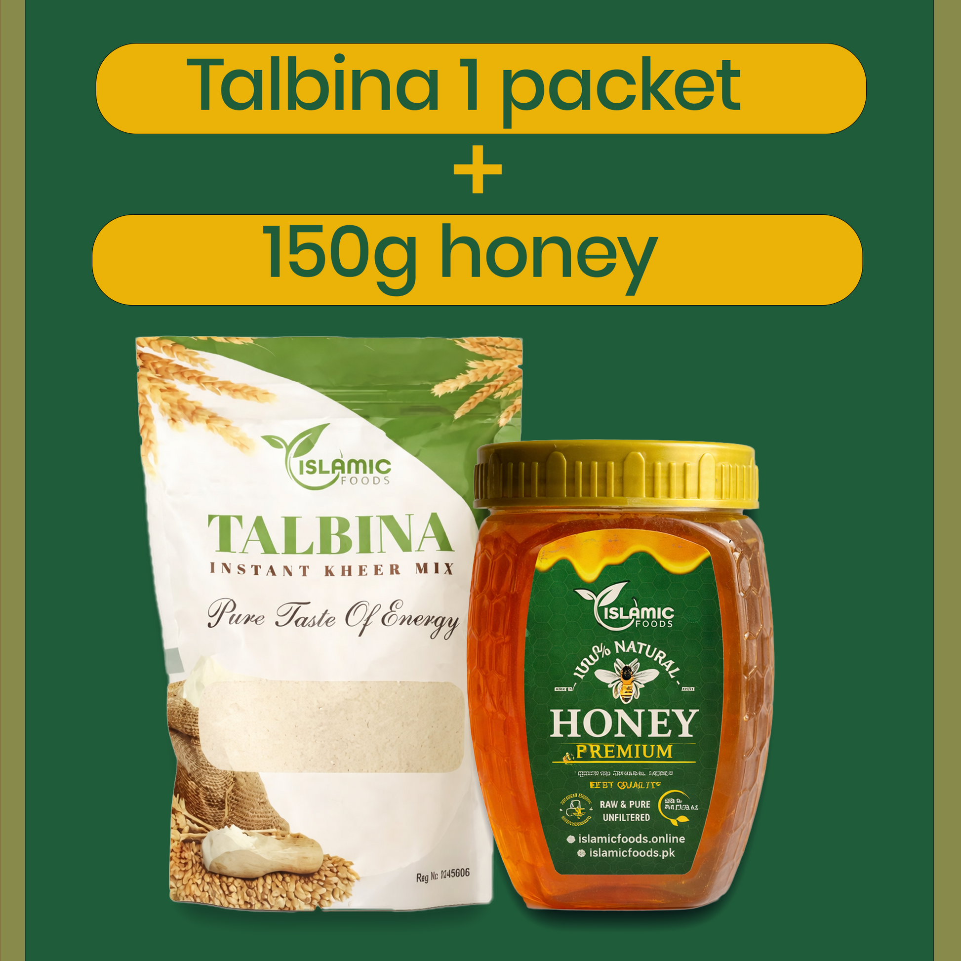 Talbina is an Arabic dish prepared with barley, milk, and honey in porridge form. It was recommended by Prophet Muhammad PBUH to his companions when suffering through an illness or weakness of any kind.